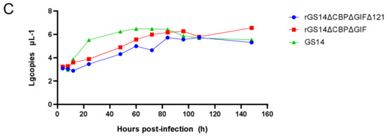 Equal TCID50 doses of rGS14ΔCBPΔGIFΔ121, rGS14ΔCBPΔGIF and GS14 viruses were inoculated into 6-well plates with full confluency of PGT cells. Cells were incubated at 37 °C with 5% CO2. The viral fluid was collected at 2 h, 4 h, 8 h, 12 h, 24 h, 36 h, 48 h, 60 h, and 72 h post-infection. The viral fluid was frozen and thawed three times. Then, the lysate was titrated for viral load at each time point by TCID50 and quantitative PCR (qPCR).