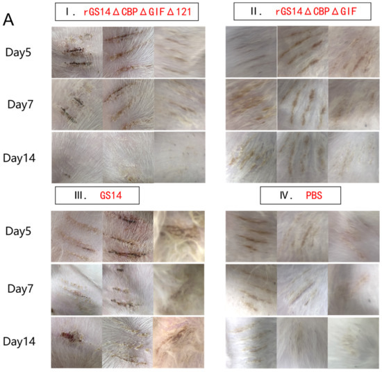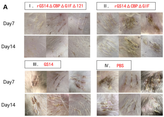 After immunization, the rGS14ΔCBPΔGIFΔ121 group, the rGS14ΔCBPΔGIF group and the PBS group showed bleeding, redness and swelling in the first two days, and the wounds gradually healed with time. There was minimal inflammatory reaction due to the feeding environment, which was healed afterwards. The GS14 group started to show pustules and herpes on day 7 in addition to bleeding, redness and swelling in the first period and then started to exhibit scabs, which were only partially healed by the 14th day (Figure 4A). By scoring the immunization sites for assessment, the rGS14ΔCBPΔGIFΔ121 group, rGS14ΔCBPΔGIF group and PBS group had lower scores on day 14 after immunization, while the GS14 group had the highest score. (Figure 4B).