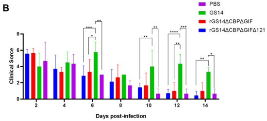 The following supporting information can be downloaded at: https://www.mdpi.com/article/10.3390/vaccines11050909/s1, Table S1: Primers used to generate and identify the recombinant viruses. Table S2: Clinical scoring sheet. Figure S1: Partial identification results of recombinant virus rGS14ΔCBPΔGIFΔ121construct.