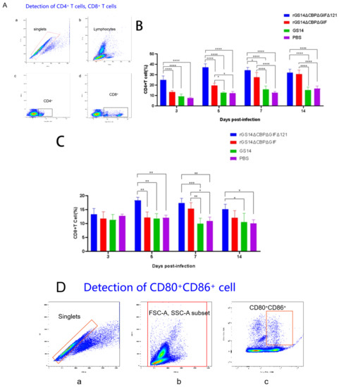 3.4. rGS14ΔCBPΔGIFΔ121 Causing High Levels of Expression of CD4+ Cells, CD8+ Cells and CD80+CD86+ Cells