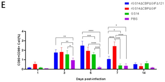 In addition to the clinical signs, we also analyzed the immune response induced by rGS14ΔCBPΔGIFΔ121. According to the literature, ORFV mainly causes cellular immune responses [12], so we chose to detect cell subpopulations such as CD4+ cells, CD8+ cells and CD80+CD86+ cells (Figure 5). Flow cytometry analysis of whole blood from the immunized goat showed that rGS14ΔCBPΔGIFΔ121 rapidly caused differentiation of PBMC to CD4+ cells, CD8+ cells and CD80+CD86+ cells. In terms of CD4+ cell subpopulations, rGS14ΔCBPΔGIFΔ121 caused an increase in the number of CD4+ cells on day 3 and maintained a consistently high level of expression (p < 0.0001), while that of rGS14ΔCBPΔGIF started to rise on day 5 and maintained a high level of expression after reaching a peak on day 7 (p < 0.0001). The number of the CD4+cell subpopulation of the rGS14ΔCBPΔGIFΔ121 group was consistently higher than that of the rGS14ΔCBPΔGIF group in the first 7 days after immunization (p < 0.05) (Figure 5B). In terms of CD8+cell subpopulation, the rGS14ΔCBPΔGIFΔ121 group induced an increase on day 5 and then maintained at a high level (p < 005), while that of the rGS14ΔCBPΔGIF group peaked on day 7 (p < 0.05) and then decreased (Figure 5C). rGS14ΔCBPΔGIFΔ121, rGS14ΔCBPΔGIF and GS14 all caused differentiation of PBMC to CD80+CD86+ cells on day 3. rGS14ΔCBPΔGIFΔ121 group peaked on day 5 (p < 0.0001) and then started to decline. The rGS14ΔCBPΔGIF group peaked on day 7 (p < 0.0001) and then declined. The GS14 group peaked on day 5 (p < 0.0001) and then declined (Figure 5E).