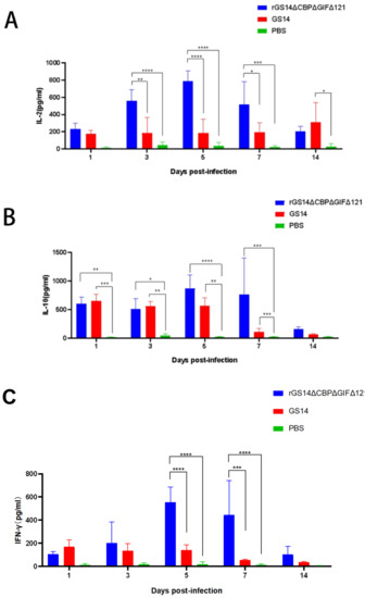 3.5. rGS14ΔCBPΔGIFΔ121 Induces High Levels of IL-2, IL-10 and IFN-γ Expression