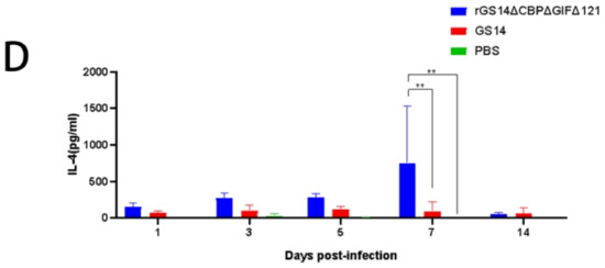 To further investigate the immune response induced by rGS14ΔCBPΔGIFΔ121, we examined the expression of IL-2, IL-10, IL-4 and IFN-γ (Figure 6). Regarding IL-2, rGS14ΔCBPΔGIFΔ121 was consistently expressed at a high level during the first 7 days (p < 0.001), starting to rise on day 3 (p < 0.0001) and reaching a peak on day 5 (p < 0.0001). The expression level of IL-2 in rGS14ΔCBPΔGIFΔ121 group was always higher than that in the GS14 group during the first 7 days (p < 0.05). GS14 caused a high level of IL-2 expression on day 14 (p < 0.05) (Figure 6A). Detection of IL-10 expression levels revealed that animals in the rGS14ΔCBPΔGIFΔ121 group started to increase in IL-10 expression levels after immunization (p < 0.01), reached a peak on day 5 (p < 0.0001) and gradually decreased after day 7 (p < 0.001). The rGS14ΔCBPΔGIFΔ121 group consistently expressed high levels of IL-10 during the first 7 days (p < 0.001) and then decreased (Figure 6B). In terms of IFN-γ, rGS14ΔCBPΔGIFΔ121 could cause high levels of expression in goats on days 5 and 7 (p < 0.0001) (Figure 6C). By detecting IL-4, rGS14ΔCBPΔGIFΔ121 caused high-level expression in goats only at day 7 (Figure 6D). Taken together, it was tentatively determined that rGS14ΔCBPΔGIFΔ121 mainly caused Th1-like cellular immune responses.