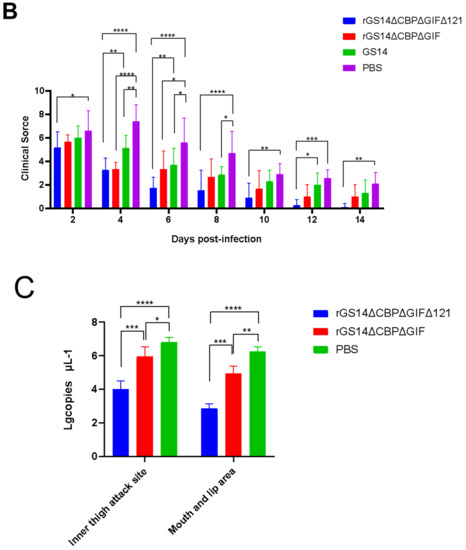 Clinical protective efficacy analysis and comparison in rGS14ΔCBPΔGIFΔ121, rGS14ΔCBPΔGIF, GS14 and PBS groups. (A) Plots of changes in clinical signs of goats in the rGS14ΔCBPΔGIFΔ121 group, rGS14ΔCBPΔGIF group, GS14 group and PBS group on days 7 and 14 after challenging the wild-type strain on the inner thigh of the other side: (I) clinical signs of three random goats in the rGS14ΔCBPΔGIFΔ121 group were completely healed by day 14; (II) clinical signs of goats in the rGS14ΔCBPΔGIF group were only partially healed by day 14; (III) clinical signs of three random goats in the GS14 group showed scabs on day 7 and only partially healed by day 14; (IV) clinical signs of three random goats in the PBS group showed scabs and other signs on both day 7 and day 14. (B) Plots of changes in clinical scores after challenging in the rGS14ΔCBPΔGIFΔ121 group, rGS14ΔCBPΔGIF group, GS14 group and PBS group. Data for each group are expressed as mean standard error. (C) Plots of ORFV viral load in tissues at the challenged site and mouth and lip area on day 14 post challenging in the rGS14ΔCBPΔGIFΔ121 group, rGS14ΔCBPΔGIF group and PBS group. The data of each group are expressed as mean standard error. * p < 0.05, ** p < 0.01, and *** p < 0.001, **** p < 0.0001.