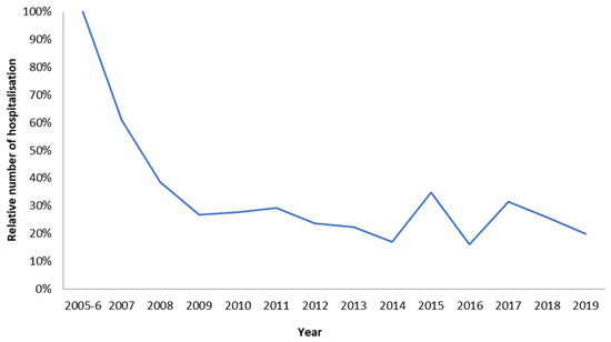 Relative number (%) of rotavirus-specific hospitalisations in years after vaccination introduction (2007–2019) versus pre-vaccination (2005–2006).