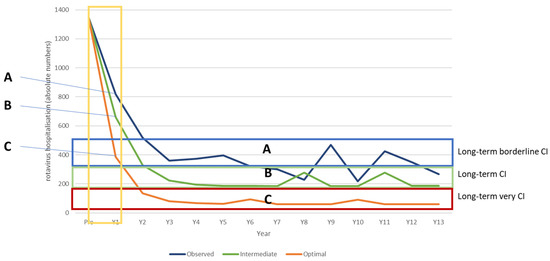 The simulation is further used to identify thresholds for vaccination launch parameters that determine when the vaccination produces better cost-impact results overall compared with the observed data. This is illustrated in Figure 6. Three scenarios are modelled, one simulating the observed Belgian data (observed), one using an optimal vaccination introduction (optimal), and one using an intermediate vaccination introduction (intermediate). For each of these scenarios, ranges are applied to key parameters, as specified in Table 8, based on the first-year results of the net effect of the vaccine introduction (indicated by the yellow box in Figure 6). As shown in Figure 6, the long-term hospitalisation reduction level differs considerably between the three scenarios with little overlap, indicated by the blue box (Category A, Belgian observed data); green box (Category B, intermediate vaccination introduction); and red box (Category C, optimal vaccination introduction). The first year determines the category reached in subsequent years because of the correlation between the herd effect in the first year and the appearance of disease peaks due to secondary sources of infection in the subsequent years.