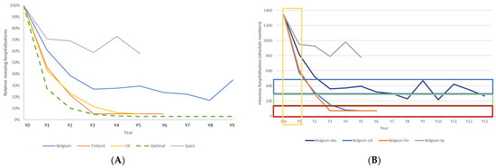 Countries across Europe have launched rotavirus vaccination programmes that differ from the Belgian launch in their initial vaccine coverage rates and date of initiating the vaccination programme. Figure 7A shows hospitalisation rates in the vaccine uptake period in three other countries in Europe that introduced rotavirus vaccination and for which data were available in the public domain [30,31,32]. Figure 7B shows the results when these data are applied in the model for the full 13-year period. Finland and the UK introduced the vaccine systematically in 2010 and 2013, respectively, starting earlier in the year than Belgium (September and July, respectively) and with very high immediate vaccine coverage rates. In Spain, the vaccine has been recommended since 2012 but is still not reimbursed, with a consequently wide range of vaccine coverage rates across the country and by year.
