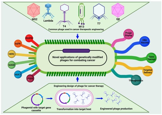 Many different types of viruses, both mammalian and bacterial, have been used for several types of biological applications [,,,,,,,,,,,,,,,,,]. Bacteriophages, i.e., prokaryotic viruses that exclusively infect bacteria, not mammalian cells, have recently attracted the attention of the scientific community as potential cancer immunotherapy agents. This is due to the ease with which they display the desired functional peptides on the body in order to achieve high specificity towards cancer cells without incurring unexpected immunogenic issues in humans. Bacteriophages exist in a variety of forms, and each form has a unique structure and is associated with a unique strain of bacteria. Bacteriophages have several potential uses, including in the phage display technique and as phage vectors for gene therapy [,,,,,,,,,,,,,,,,,,,]. Phages capitalize on genetic plasticity to alter their surface, thus opening a new dimension in the prospective use of bacteriophages for medicinal purposes. Protein–protein interactions, receptor-binding sites, epitopes, mimotopes, and functional sites of antigens may be quickly and efficiently detected using the phage display approach []. Figure 1 provides a comprehensive summary of the various types, designs, and applications of engineered phages described in this review and outlines the different approaches used to engineer phages and the diverse applications of these methods, serving as a valuable visual aid in the understanding of the key concepts presented in this review.