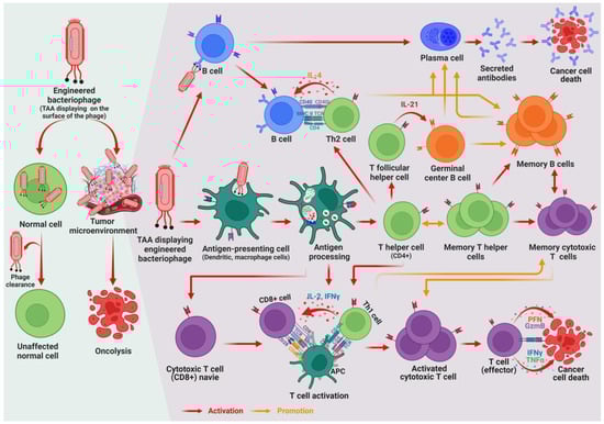 Phages have the ability to engage with pattern recognition receptors (PRRs), notably toll-like receptors (TLRs), which identify pathogen-associated molecular patterns (PAMPs) and damage-associated molecular patterns (DAMPs). The engagement between phages with PRRs activates innate immunity pathways, cytokine generation, and immune cell recruitment to infection sites, leading to the establishment of an adaptive immune response commenced by antigen-presenting cells (APCs) such as dendritic cells (DCs). Phages engulfed by APCs and a foreign antigen expressed on an engineered phage can be presented via major histocompatibility complexes (MHCs), recognized by naive T cells, and activated toward effector or memory functions. The antigen presentation on MHC-I leads to the differentiation of CD8+ T cells into cytotoxic T lymphocytes (CTL) that directly kill infected host cells, while antigen presentation on MHC-II triggers CD4+ T cell differentiation into T helper (Th) cells that assist B cells to produce specific antibodies against antigens, provided that the APC also displays costimulatory ligands [,,]. Therefore, the design rationale and use of phage-based vaccines require comprehensive knowledge of the interactions between phages and immune cells. Considering both phage immunogenicity and immunomodulatory activity, researchers can develop more effective vaccines that stimulate humoral and cellular responses.