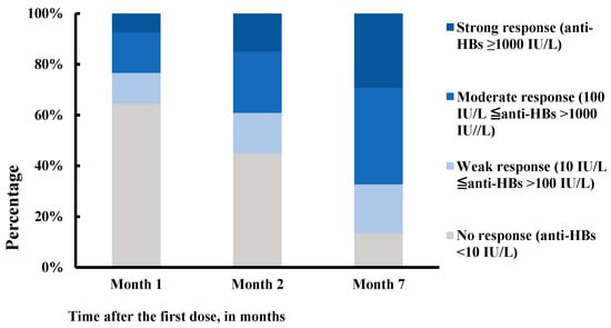 Furthermore, this study tracked the proportion of respondents and anti-HBs GMT following each vaccine dose. After two doses, the response rate and GMT were only 55.1% and 15.7 IU/L, respectively. A third dose substantially improved the vaccine effectiveness. Therefore, in clinical practice, it is essential to complete the standard vaccination schedule; otherwise, patients with lower anti-HBs titers will not be fully protected by the vaccine.