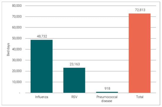 Our study has limitations. One is that our model is based on retrospective analysis of 2018/19 hospitalisation patterns for flu, PD and RSV and 2021/22 hospitalisations for COVID-19. We assumed these periods to model a winter where seasonal respiratory diseases are circulating again after the COVID-19 lockdowns. While this is a justifiable choice in the absence of more recent data, it has implications for the vaccine-specific contributions to the volume of preventable bed days and their value estimated by our model. As discussed above, the COVID-19 booster vaccine is a major contributor to the model outcomes. Nonetheless, observational data from the most recent 2022/23 winter have shown a surge in hospitalisations and excess deaths due to respiratory diseases like flu and pneumonia compared to previous winters []. Therefore, the hospitalisations prevented by non-COVID-19 vaccines may be currently underestimated. Further, the incidence of COVID-19 disease in Europe has showed a decreasing trend since its peak in 2021/22 [], thanks to effective vaccination campaigns. As a result, in future winters we could expect less asymmetry in the volume of hospitalisations prevented by each vaccination programmes than currently estimated by our model.
