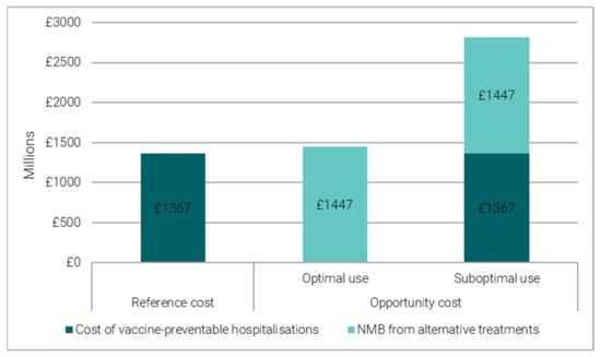 - When vaccine-preventable hospitalisations are a suboptimal use of hospital beds, their opportunity cost is proxied by the total economic cost, given by the sum of the forgone benefit (NMB) from alternative treatments and the cost of vaccine-preventable hospitalisations.