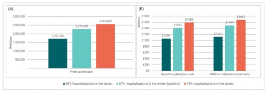 Assuming constant hospitalisations across the year (50% of the annual hospitalisations in the winter) would decrease the volume of freed-up bed days, hospitalisation costs averted, and NMB from alternative treatments by approximately 25% compared to the baseline. Assuming a tripling of hospitalisations in the winter (75% of the annual hospitalisations) would increase these estimates by about 13% compared to the baseline.