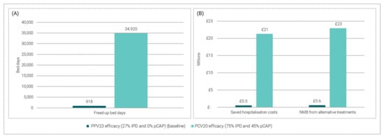 Impact of replacing PPV23 with PCV20: (A) Vaccine-preventable bed days; (B) Saved hospitalization costs and NMB from alternative treatments.