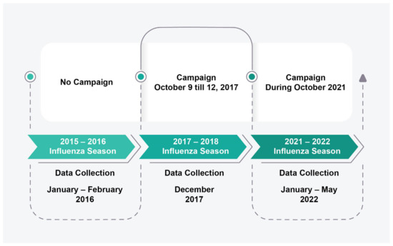 The timeline of this study, showing the three influenza seasons targeted, the awareness campaigns carried out, and the timeframe of data collection are depicted in Figure 1.