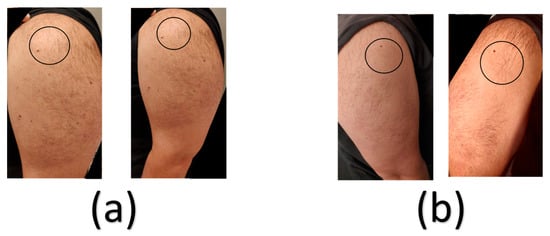 Sites of both the COVID-19 and influenza vaccines’ injection sites. Images in panel (a) show the injection site of the COVID-19 vaccine in the left arm (circled in black). Images in panel (b) show the injection site of the influenza vaccine in the right arm (circled in black).