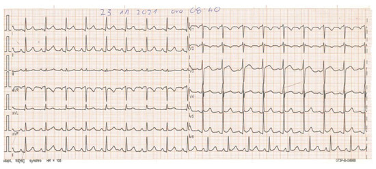ECG on admission. The heart rate of 106 beats per minute, a left axis, sinus rhythm, and a slight elevation in the ST segment in leads I and II.