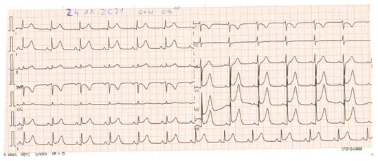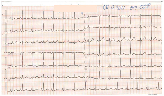 Her clinical condition worsened about 8 h after admission; she had chest pains and hypotension, so a second ECG, echocardiography, and cardiac enzymes were performed. The second ECG revealed pericardial lead ST segment elevation (Figure 3), whereas echocardiography revealed myocardial hypocontractility with a severe decrease in ventricular ejection fraction below 30%. The cardiac enzymes were elevated compared to the first measurement, as follows: creatine kinase—from 32 to 201 (ref. range: 30–135 units/L), creatine kinase MB—from 10 to 44 (ref. range: 0–7 mcg/L), and troponin I—from 0.18 to 6.37 (ref. range: 0–0.04 ng/mL). Therefore, a continuous infusion of noradrenalin was initiated at 4 mcg/kg/min (with reductions up to 2 mcg), which improved her blood pressure and heart rate.