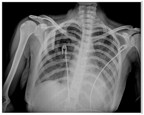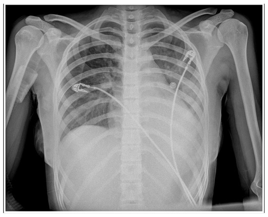 After about 16 h, the child’s condition worsened, with decreased blood saturation and signs of heart failure with pulmonary vascular congestion, as seen on the chest X-ray (Figure 4). As a result, supportive respiratory care was provided for 24 h using continuous positive airway pressure (CPAP), and rehydration was concurrently maintained using fluids, diuretics, and inotropes (dopamine and noradrenalin).