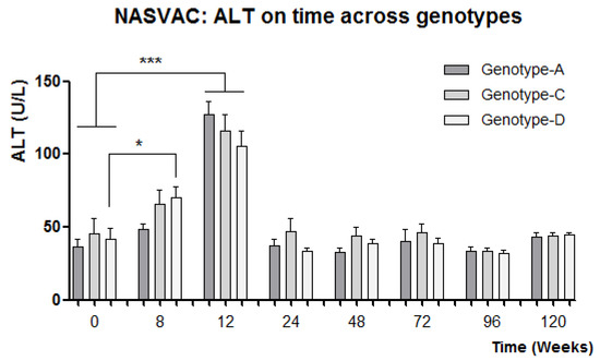 Figure 2. Relationship between ALT kinetics in different HBV genotypes. HBV genotype-A, HBV genotype-B, HBV-genotype C has been shown by bars. * p < 0.05: statistically significant differences; ***: p < 0.001, very significant differences (One-way ANOVA followed by Tukey’s multiple comparison test).