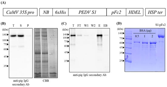 Schematic representation of the PEDV S1:pFc2 construct and production of PEDV S1:pFc2 from N. benthamiana leaves. (A) Schematic representation of the NBH1:PEDV S1:pFc2 construct. CaMV 35S pro, cauliflower mosaic virus 35S promoter; NBH1, signal peptide from Binding Protein and 6 His-tag; PEDV S1, porcine epidemic diarrhea virus S1 protein; pFc2, porcine Fc domain; HDEL, ER retention signal; and HSP ter, heat shock protein terminator. (B) Western blot analysis after sup-pellet fractionation. T, total; S, supernatant; and P, pellet. (C) Western blot analysis of protein fractions obtained at different steps of the purification process. T, total; FT, flow-through; W1, wash 1; W2, wash 2; E, eluate; and EB, protein sample eluted from protein A agarose. (D) SDS-PAGE analysis of purified NBH1:PEDV S1:pFc2. Bovine serum albumin (BSA) was used as a loading control to determine the amount of purified NBH1:PEDV S1:pFc2. kDa, kilo Dalton.