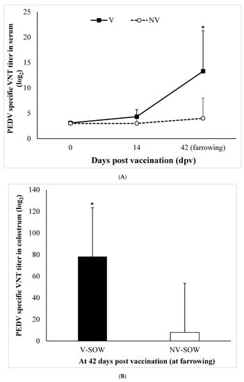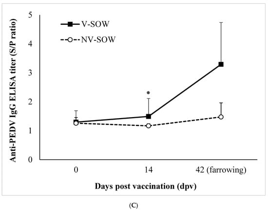 There was a significant (p < 0.05) difference in the log-transformed VNT titers of serum and colostrum antibodies between vaccinated and non-vaccinated sows (Figure 3A,B). We also observed a significant (p < 0.05) difference in serum antibody ELISA titers probing PEDV between vaccinated and non-vaccinated sows (Figure 3C).