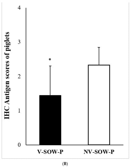 The results of the study demonstrated that the vaccinated piglets had significantly lower histopathological lesion and antigen scores compared to the piglets of non-vaccinated sows (p < 0.05) (Figure 4).