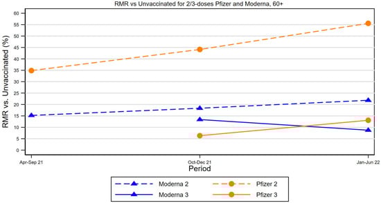Figure 1 summarizes in graphical form the principal RMR results for ages 60+ from Table 2. It shows RMR data points by time period for two-dose Pfizer recipients, two-dose Moderna recipients, and during the booster period, for three-dose Pfizer and three-dose Moderna recipients, all versus the unvaccinated. The upward slopes over time for two-dose vaccinees confirm waning vaccine effectiveness over time. The gap between the Pfizer and Moderna lines for two-dose vaccinees shows the Moderna advantage over Pfizer. The solid lines for three dose recipients are well below the two-dose lines and thus illustrate the value of the third booster dose in reducing mortality, for both vaccines. The gap between the two-dose and three-dose lines provides a measure of the mortality risk reduction from a booster. The Figure also shows that RMRs for both vaccines are similar after three doses. The reduction in RMR from a third dose is larger for Pfizer than for Moderna; reflecting higher Pfizer two-dose RMRs but similar three-dose RMRs.