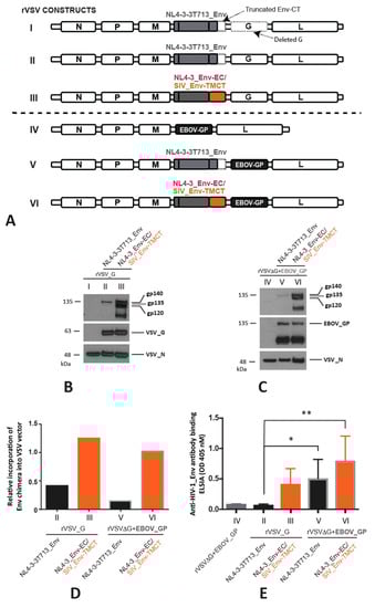 Figure 1. Expression and immunogenicity of HIV-1 Env on VSV vectors. (A) The HIV-1 Env with a truncated C-terminal cytoplasmic tail (CT) (NL4-3-3T713_Env) and chimeric HIV-1 Env with an ecto/extracellular domain of gp120/gp41 and the transmembrane (TM) and truncated CT of SIV Env, shown in orange, (NL4-3_Env-EC/SIV_Env-TMCT) were expressed when cloned in cis into a recombinant (r) VSV vector (first two constructs I and II) or into an rVSV in which the VSV G glycoprotein gene was deleted and replaced with the Ebola virus glycoprotein gene (EBOV_GP) (next three constructs, III, IV, and V). All HIV-1 Env sequences were derived from the laboratory strain NL4-3. Construct III is a control rVSV construct without the modified NL4-3 Env’s but with EBOV_GP replacing the VSV_G. The Western blots in (B,C) show the expression of the truncated NL4-3-3T713_Env (gp135 or 135 KDa) and of the NL4-3_EnviEC with the SIV_Env-TMCT (~gp140) using the primary anti-gp120 B13 antibody. The NL4-3 Env-EC is cleaved from the SIV_Env-TMCT, resulting in a gp120 detected by the B13 antibody. Blots were also probed to detect the VSV_G and VSV_N proteins (B) and EBOV GP and VSV_N proteins (C). The expressions of the various HIV-1 Env products relative to VSV_N are shown in (D) with the constructs with the SIV_Env-TMCT shown with an orange bar. Seven BALB/c mice in each of five groups were immunized by intramuscular injections with one of five rVSV constructs illustrated in (A) with the mice immunized with the constructs containing the SIV_Env-TMCT shown with an orange bar. Anti-HIV-1_Env antibody response in mouse sera was measured at 28 days post-immunization using ELISA, * = p < 0.05, ** = p <0.01 (E).