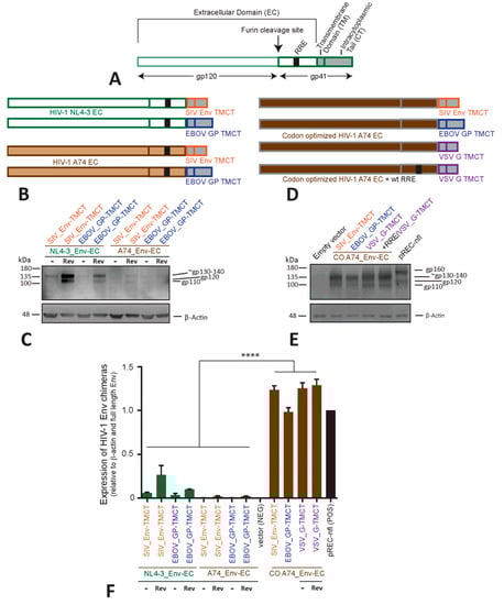 Figure 2. Generation and characterization of chimeric HIV-1 Env immunogens. (A) Schematic representation of a linear wild type (WT) HIV Env made up of two main subunits, gp120 and gp41. Gp120 and gp41 contain the Env signal peptide (SP), extracellular domain (EC), Rev-response element (RRE) (within the mRNA), transmembrane domain (TM), and cytoplasmic tail (CT). (B) Various Env chimeras were generated utilizing either HIV-1 NL4-3 (green) or A74 Env EC (light brown), and then replacing the HIV Env TM and CT domains with those of SIV Env (red) or EBOV glycoprotein (blue). The genes encoding these Env chimeras (B) were cloned into pcDNA3.1, transfected into HEK-293T cells, and the following Env protein expression was measured in cell lysates with Western blots for the anti-HIV-1 Env B13 antibody and probing with anti-β actin antibody as a loading control. (C,D) Similar Env chimeras were cloned in the pcDNA3.1 as described in (B) but now with a codon-optimized (CO) HIV-1 A74 EC (dark brown) linked to the SIV_Env (red), EBOV_GP (blue), or VSV_G (purple) TMCT. The expression of these chimeras in transfected HEK-293T cells is shown in the western blot (E). The expression of all the Env chimeras relative to β-actin (as measured by western blot (C,D)) is shown with **** representing p < 0.0001 (ANOVA) (F). The western blots in panels (B,D) were run on the same day and represent the data from transfections of all the constructs performed on the same day. To ensure the CO A74-EC bands were visible in panel (E), the exposure time is reduced as compared with that in panel (D).
