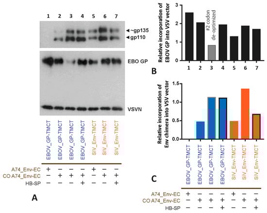 Figure 6. Examining the expression of primary A74 HIV-1 Env chimera on rVSV particles. (A) Purified rVSV particles were lysed and analyzed by western blot for chimeric Env and VSV-N content. VSV-N was used as a loading control. Incorporation of the EBOV_GP (B) and HIV-1 Env chimera (C) into rVSV was measured relative to the VSV_N expression following densitometry scanning. The colors represent the different constructs, i.e., the A74 and CO A74 with the EBOV_GP-TMCT (blue) or the SIV_Env-TMCT (orange).