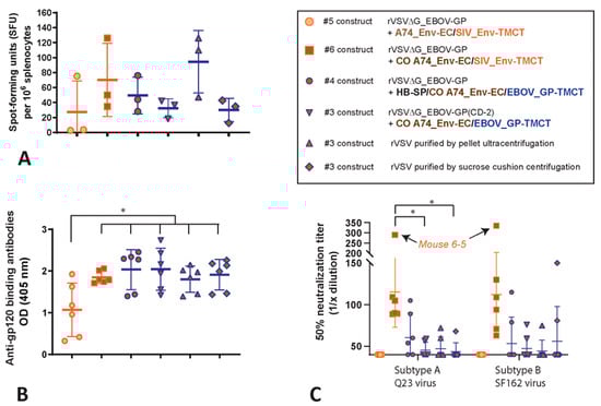Mice (six per group) were immunized by IM with rVSV∆G+EBOV_GP vectors expressing either wild type A74_Env-EC/SIV_Env-TMCT (construct #5, Figure 4), CO A74_Env-EC/SIV_Env-TMCT (construct #6), or CO A74_Env/EBOV_GP-TMCT (with the Hb-SP) (construct #4). Three additional groups were immunized by IM with the rVSV∆G+CDO-2_EBOV_GP vector expressing CO A74_Env-EC/EBOV_GP-TMCT (construct #3). For these three groups, the rVSV vaccine vector used for vaccination was purified by three different techniques: (i) resuspension of the pellet after ultracentrifugation, (ii) removal from a sucrose cushion after centrifugation, and (iii) retention after centrifugation on a 100 kDa size exclusion column. Sera and spleens were collected four weeks post-immunization. Splenocytes were incubated with a pool of 37 peptides (15-mers) derived from a gp120 subtype B consensus peptide pool and then assessed for the number of spot-forming units (SFU) expressing interferon gamma (IFN-γ). In the mice immunized with the rVSV vectors, low numbers of IFN-γ-producing, activated CD4+ and CD8+ T cells are detected upon incubations with Env peptides (Figure 7A). The dotted line shows the background SFU per million splenocytes. The peptides in the pool were selected based on the best conservation between consensus subtypes A and B in the C1 and V1 domain.