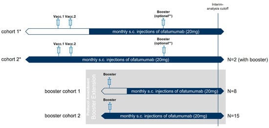 The original study protocol comprised cohort 1 and cohort 2, which included patients who received their initial vaccination (i.e., the first and second doses of SARS-CoV-2 mRNA vaccines) during the study either before ofatumumab was started or during stable ofatumumab therapy (Figure 1). Stable ofatumumab treatment was defined as treatment that had been started at least four weeks ago. The depletion of B-cells was verified before vaccination. The week 1 and month 1 results of cohort 1 and cohort 2 have been published previously []. Booster vaccinations in these cohorts were optional. We here report the booster vaccination results of 2 patients in cohort 2 (Figure 1).