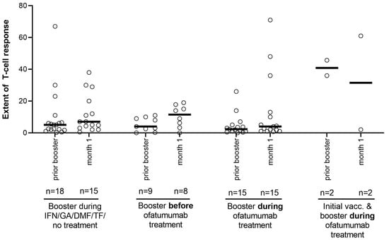 Accordingly, T-cell reactivity towards SARS-CoV-2 vaccines showed a slight increase in all booster cohorts at month 1 after the booster vaccination, irrespective of whether patients were vaccinated prior to ofatumumab or during continuous ofatumumab or whether they received other DMTs when vaccinated.