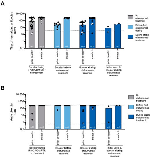 (A) Quantification of SARS-CoV-2-specific neutralizing antibody titer in U/mL after booster vaccination prior to or during ofatumumab treatment. (B) SARS-CoV-2-specific serum total antibody titer in U/mL after booster vaccination prior to or during ofatumumab treatment. All patients with available data were included in the analysis and individual values are represented by dots. Grey dots = patients who seroconverted after booster. Bars show median values, black dotted lines indicate assay-specific cut-off for seropositivity and grey dotted line indicates the maximal value of quantification range. DMF: dimethyl fumarate; GA: glatiramer acetate, IFN: interferon-beta; n: number of patients with assessments; TF: teriflunomide.
