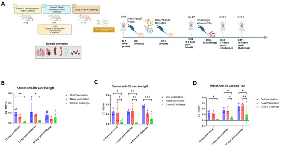Antibody titers were determined using an enzyme-linked immunosorbent assay (ELISA) to evaluate the levels of Bb-specific antibodies in the serum, intranasal washes, and feces of vaccinated and challenged rats. Blood was sampled via the intracardiac route into BD Microtainer SST Tube (Becton Dickinson, Heidelberg, Germany) and incubated for 30 min at room temperature. All blood samples were centrifuged at 10,000× g for 10 min at 4 °C. The supernatants were harvested and stored at −20 °C until analysis. Feces were added to an Eppendorf tube, with 1 mL of PBS and a 1% 1× protease inhibitor cocktail (Thermo Scientific, Rockford, IL, USA) per 100 mg of the sample, and shaken until a homogeneous suspension was obtained. Intranasal washes were sampled after the animals had been euthanized, by flushing 400 µL of PBS through the trachea and collecting it via the nares. Fifty microliters of each intranasal sample was added to a DNase- and RNase-free tube, which was then stored at −80 °C until analysis. We added 35 µL of a 10× protease inhibitor cocktail to the remaining volume. Fecal and intranasal samples were centrifuged at 10,000× g for 10 min at 4 °C, and the supernatants were harvested and stored at −20 °C until analysis.