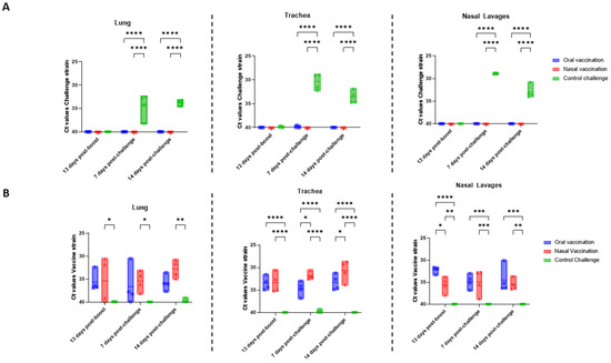 The mucosal administration of live attenuated Bb has been shown to prevent colonization in dogs [17,18]. We investigated whether or not the same vaccination procedure in rats also decreased Bb load in the respiratory tract of this species. Moreover, the standard detection method for Bb in dogs is the culture of bacteria from intranasal swabs. Here, the detection of bacteria in lavages from three organs was explored: the trachea, lung, and nose. A quantitative real time PCR (qPCR) was employed to differentiate between the vaccine and challenge strains. Tracheal, lung, and nasal lavages from the animals were sampled 13 days post-boost and 7 and 14 days p.c. Samples were processed and analyzed via qPCR with primers specifically targeting either the challenge or the vaccine strain. The Ct values resulting from the real-time qPCR were studied and compared between animals (hereafter referred to as Ct values). Before vaccination and challenge infection, the absence of the bacterium from the trachea, lung, and nasal lavages of nine animals was tested; and neither the vaccine strain nor the challenge strain was detected (data not shown). Bacterial load in the upper and lower respiratory tract decreased significantly, at 7 and 14 p.c., in animals vaccinated orally or intranasally, where the challenge strain was not detected (Figure 2A). In contrast, the challenge strain was present at significant levels, at all three sites studied, after challenge in the non-vaccinated control (Figure 2A). Bacterial loads in the lungs were low but were similar at 7 and 14 p.c. in the control group (Figure 2A). Also, in the control group, the bacterial loads in the trachea and nasal lavages were initially higher but were significantly reduced 14 days post-challenge (Supplementary Materials, Figure S4). The data demonstrate that the challenge strain of Bb effectively colonizes non-vaccinated animals, and that mucosal vaccination prevents this phenotype.