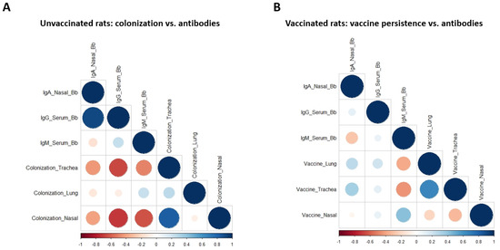 Mucosal and systemic antibodies correlate with lower bacterial burden in the respiratory tract. Correlograms values were calculated with R. Unvaccinated rats 7 and 14 days after challenge showing a strong negative correlation between the colonization and the antibodies (A). Antibodies of vaccinated animals which were positive but not strongly correlated with the vaccine presence in the respiratory tract (B). Positive correlations appear as blue circles and the negative correlations appear from orange to red. The size of the circle indicates the strength of the correlation.