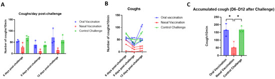 Furthermore, it was investigated if vaccination provides protection against the main clinical sign of CIRDC, cough. It was hypothesized that the induction of mucosal and systemic Bb-specific antibodies observed with both routes of administration would attenuate clinical signs. It was shown before that mucosal vaccination against Bordetella pertussis attenuated coughing in challenged rats [22]. In this study, rats were vaccinated on day 0 and day 21, with 108 CFU orally and 106 CFU intranasally, and then challenged on day 35 with a virulent Bb strain. Video recordings were performed on three animals from each group on days 6, 9, and 12 p.c. and subsequently analyzed. On day 6, control animals coughed a mean of 70 times in 10 min, whereas orally vaccinated rats coughed a mean of 50 times while intranasally vaccinated rats coughed a mean of 30 times. Thus, on day 6, coughing was reduced in both vaccinated groups, but this difference with respect to the non-vaccinated controls was significant only for the intranasal group (Figure 4A). On day 9, coughing had decreased in all groups and there were no significant differences between any of the groups. Finally, 12 days after challenge infection, coughing increased in the orally vaccinated and control rats, to levels significantly higher than those in intranasally vaccinated rats, which remained low (Figure 4A,B). Observations of the cumulative numbers of coughs over the three days of recording revealed significantly fewer coughs in the intranasally vaccinated animals than in the orally vaccinated and not vaccinated control animals, with similar numbers of coughs in these last two groups (Figure 4C). These data suggest that intranasal vaccination reduces cough caused by virulent Bb strains, whereas oral vaccination does not.