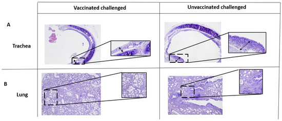 Signs of inflammation in the lung and trachea after challenge. Lung and trachea of each animal after challenge were stained with hematoxylin and eosin (H&E) and images are displayed at 20× magnification. Lesions of the trachea of vaccinated and unvaccinated animals after challenge are shown (A). Lesions of the lung of vaccinated and unvaccinated animals after challenge are shown (B). Four animals per group.