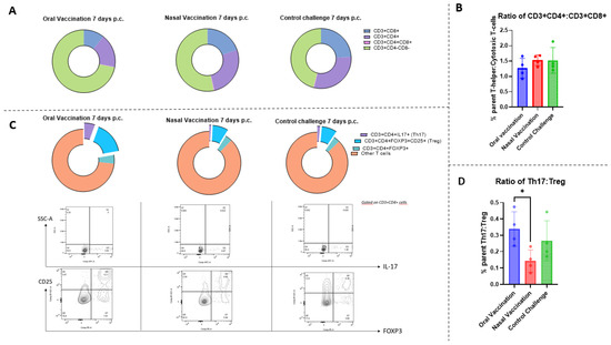 Oral vaccination leads to increase in Th17:Treg ratio of cell within splenic T-cells 7 days after challenge. Percentage of parent of CD3+CD4+, CD3+CD8+ and double-negative and doble-positive T-cells (A). Ratio of the percentage of CD4+ cells to the percentage of CD8+ cells within the CD3+ population (B). Percentage of parent and dot plots of CD3+CD4+IL17+ (Th17) and CD3+CD4+FOXP3+CD25+ (Treg cells) (C). Ratio of the percentage of parent of CD3+CD4+IL17+ to the percentage of parent of CD3+CD4+FOXP3+CD25+ (D). Each dot represents an individual rat. The error bars represent the standard error of the mean (n = 4 per group). The asterisks and brackets refer to statistical significance determined via ANOVA with multiple comparisons; * p ≤ 0.05.
