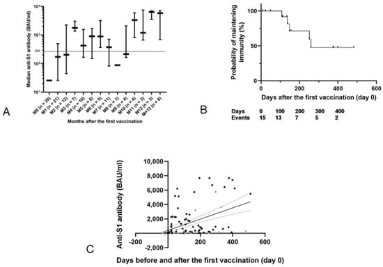 The serologies of 15 patients who acquired post-vaccination immunity during the first 3 months after vaccination, with an anti-S1 antibody level above 264 BAU/mL, were analyzed. The probability of maintaining immunity against SARS-CoV-2 decreased over time, reaching the level of 50% at 259 days post-vaccination, as shown in Figure 1B.