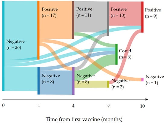The serological variations over time are shown in Figure 2. This alluvial diagram represents the evolution over time of the serologies of patients initially not immunized against COVID-19. The connections between the panels allow the seropositive or seronegative status of each patient to be followed at each month where the data is available. The COVID panel corresponds to patients who became COVID positive during the follow-up and whose vaccine serostatus can therefore no longer be interpreted after the viral infection. This COVID panel was created to avoid the false conclusion that a patient became seropositive after the vaccine when post-infectious immunity was acquired. Thus, among 26 patients with an initial negative serology, six had a COVID-19 infection; nine acquired a satisfactory immunity persisting more than 10 months after vaccination; and only one remained seronegative at 10 months after the first vaccine dose. Figure 2 emphasizes that the vaccine seroconversion remained positive between the 4th and 10th month.