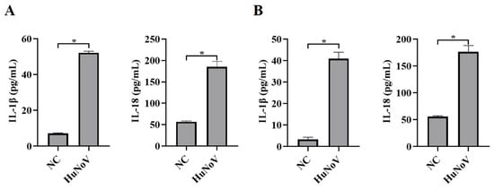 HuNoV facilitates the secretion of IL-1β and IL-18. (A) HIEs were infected with HuNoV at a genome copy of 3.0 × 107 or treated with the virus preservation solution (NC) for 48 h, and the culture supernatants were collected for analyzing secreted IL-1β and IL-18 levels by ELISA. (B) Caco2 cells were transfected with the full-length HuNoV cDNA clone or empty vector (NC) for 48 h, and the culture supernatants were collected for analyzing secreted IL-1β and IL-18 levels by ELISA. * p < 0.05.