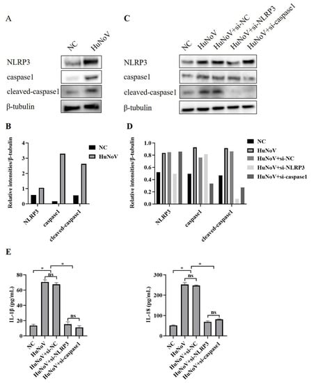 NLRP3 activation in Caco2 cells induced by HuNoV. (A,B) Caco2 cells transfected with plasmids encoding the full-length cDNA of HuNoV or empty vector (NC) for 48 h were lysed, then immunoblotted for NLRP3, caspase1, cleaved-caspasse1, and β-tubulin, and these blots were quantified by Image J. Caco2 cells were transfected with siRNA (si-NC, si-NLRP3, and si-caspase1) for 12 h, and then the cells were transfected with empty vector (NC) or the plasmids encoding the full-length cDNA of HuNoV. After 48 h of culture, we collected the cell lysates and supernatants. (C,D) The expressions of NLRP3, caspase1, cleaved-caspase1, and β-tubulin in cell lysates were analyzed by Western blot and quantified by Image J. (E) The levels of secreted IL-1β and IL-18 in cell culture supernatants were measured by ELISA. * p < 0.05; ns, no significant difference.