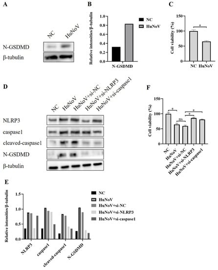 NLRP3 inflammasome activation caused by HuNoV-induced N-GSDMD-driven pyroptosis. Caco2 cells were transfected with the full-length HuNoV cDNA clone or empty vector as negative control (NC) for 48 h. (A,B) Cells were lysed and then immunoblotted for N-GSDMD and β-tubulin, and these blots were quantified by Image J. (C) CCK-8 assay detected the cell viability of Caco2 cells. Transfecting Caco2 cells with siRNA (si-NC, si-NLRP3, and si-caspase1) for 12 h, and then the cells were transfected with empty vector as negative control (NC) or plasmids encoding the full-length cDNA of HuNoV for 48 h. (D,E) Cells were lysed and then immunoblotted for NLRP3, caspase1, cleaved-caspasse1, N-GSDMD, and β-tubulin, and these blots were quantified by Image J. (F) The cell viability of Caco2 cells was detected by CCK-8 assay. * p < 0.05; ns, no significant difference.