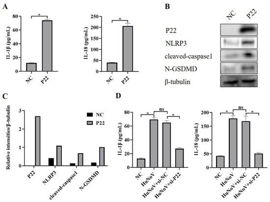 P22 is a non-structural protein encoded by HuNoV [,], and we transfected Caco2 cells with a P22-encoding plasmid or empty vector (NC) and found that P22 significantly increased secretion of IL-1β and IL-18 (Figure 4A). Further, we found that P22 also increased the expression of NLRP3 and cleaved-caspase1, as well as the proteolytic processing of GSDMD to N-GSDMD (Figure 4B,C), and we also found that P22-specific siRNA inhibited the full-length HuNoV cDNA clone that activated the NLRP3 inflammasome (Figure 4D), suggesting that P22 plays an important role in the activation of NLRP3 inflammasome and N-GSDMD-driven pyroptosis caused by HuNoV.