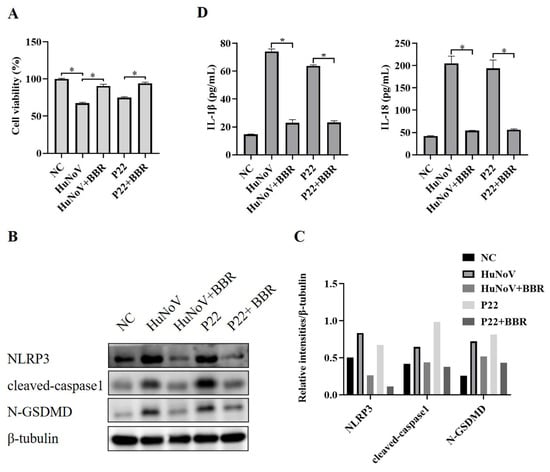 BBR reduces the cytotoxicity of HuNoV and P22 on Caco2 cells by inhibiting NLRP3 inflammasome activation. Caco2 cells were separately transfected with the full-length HuNoV cDNA clone, P22, or empty vector (NC) for 24 h and then treated with BBR (100 μM) for 48 h. (A) CCK-8 assay was used to detect cell viability. (B,C) The expressions of NLRP3, cleaved-caspase1, N-GSDMD, and β-tubulin in cell lysates were analyzed by Western blot, and then these blots were quantified by Image J. (D) The levels of secreted IL-1β and IL-18 in cell culture supernatants were collected and measured by ELISA. * p < 0.05.