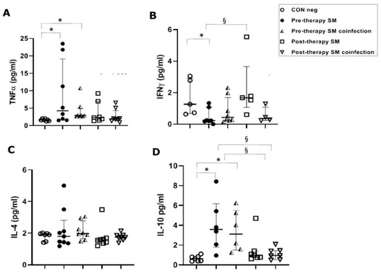 Cytokine concentrations in serum samples from pre-therapy (Pre-therapy SM) and post-therapy (Post-therapy SM) Schistosoma mansoni (SM) patients (mono- and co-infected) (n = 16) vs. healthy controls (CON Neg) (n = 9). Values are expressed as median and quartile ranges; significant differences were evaluated by the Kruskal–Wallis test plus Dunn’s test. (A) TNFα. * p ≤ 0.05 pre-therapy vs. healthy control (mono- and co-infected); (B) IFN-γ. * p ≤ 0.05 pre-therapy vs. control and § p ≤ 0.05 post therapy vs. pre-therapy (mono-infected only); (C) IL-4. No significant differences found; (D) IL-10. * p ≤ 0.05 pre-therapy vs. control and § p ≤ 0.05 post-therapy vs. pre-therapy.