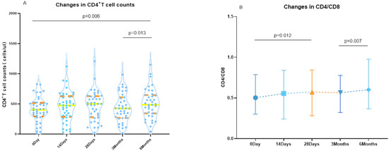 Repeated measures ANOVA was conducted to analyze CD4 counts at various time points (i.e., before vaccination, 14 days, 28 days, 3 months, and 6 months after vaccination) in the study population. The Greenhouse–Geisser estimate of deviation from sphericity was calculated as ε = 0.914, which was statistically significant (p = 0.002). Subsequent multiple comparisons revealed that CD4+ T-cell counts were significantly higher than baseline levels at both 14 and 90 days post-vaccination (p = 0.003 and p = 0.016, respectively) (Figure 1A). Conversely, the Friedman test analysis showed no significant change in CD8+ T-cell counts at different time points (i.e., before vaccination, 14 days, 28 days, 3 months, and 6 months after vaccination), with a p-value of 0.156.